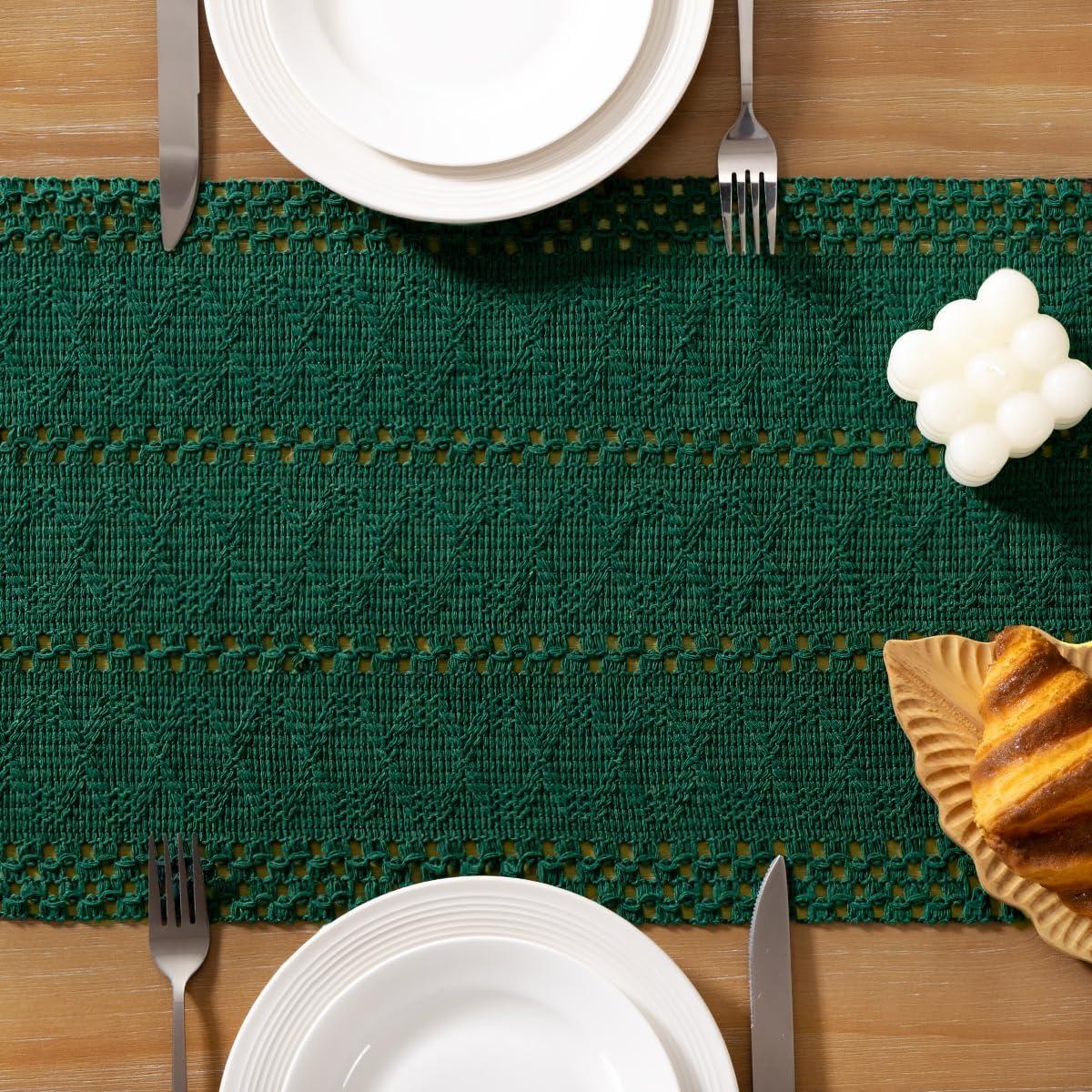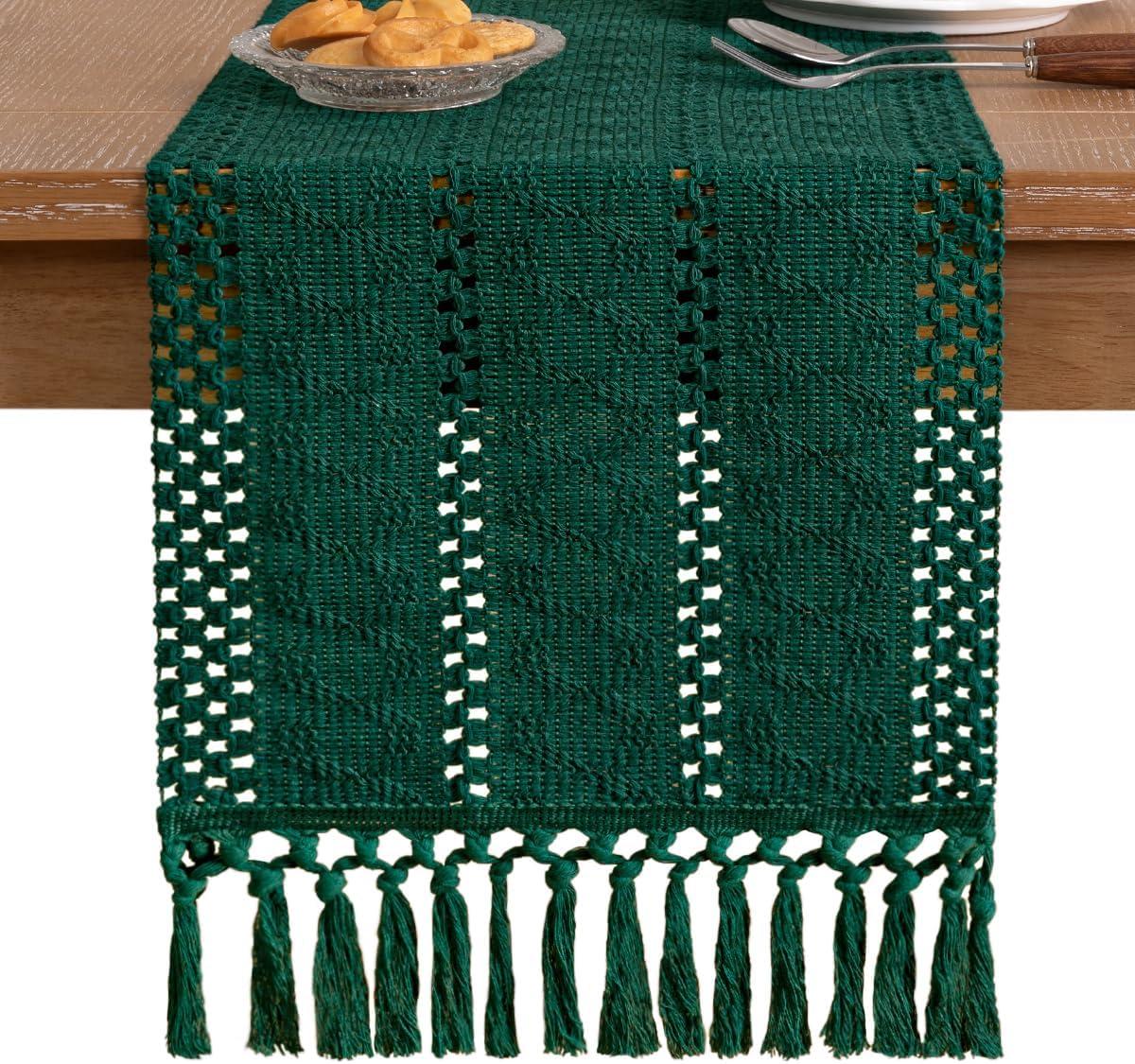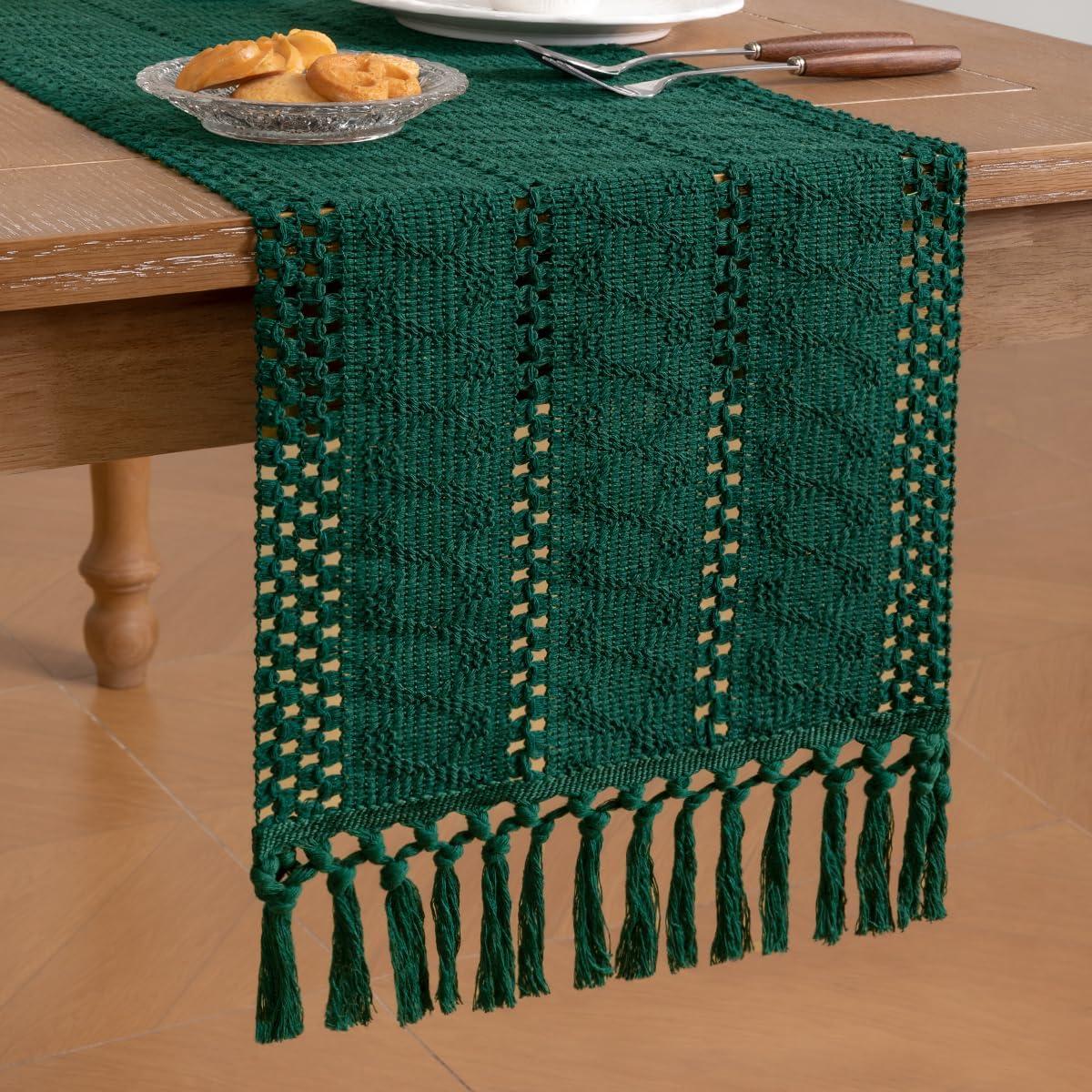 Socomi Boho Table Runner Macrame Fall Thanksgiving Farmhouse Woven Cotton Linen Rustic Coffee Table Runner with Tassels for Small Dresser Scarf Home Decor Dining Room 12x72 inch Champagne(Emerald Green)