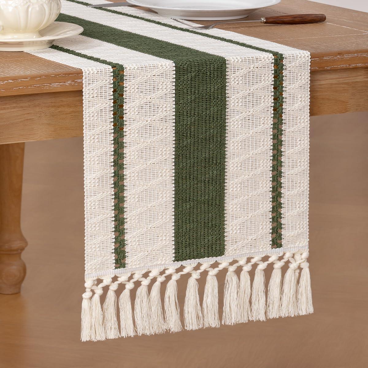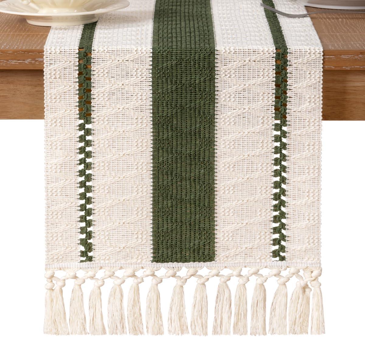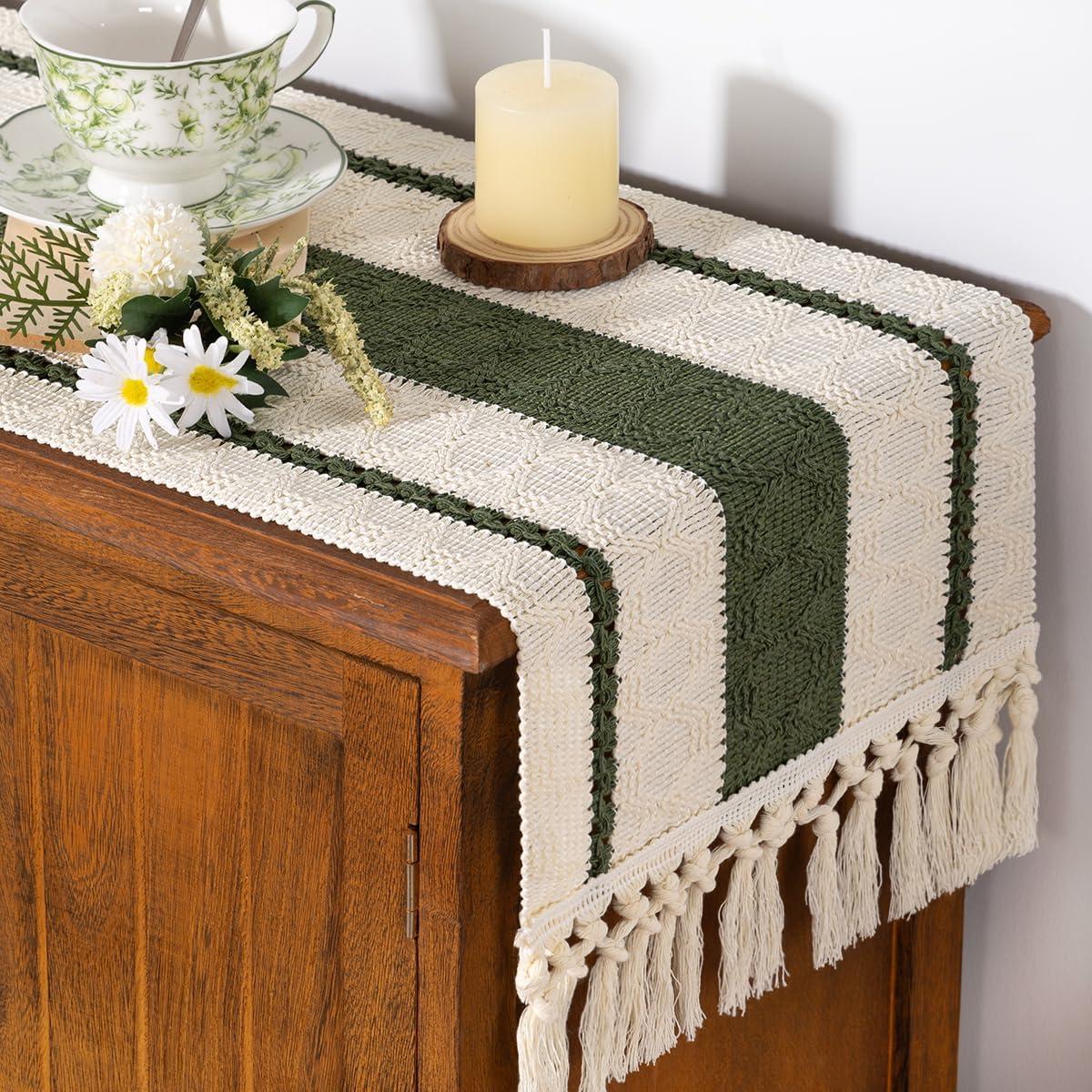 Socomi Boho Table Runner Macrame Fall Thanksgiving Farmhouse Woven Cotton Linen Rustic Coffee Table Runner with Tassels for Small Dresser Scarf Home Decor Dining Room 12×72 inch Champagne(Emerald Green)