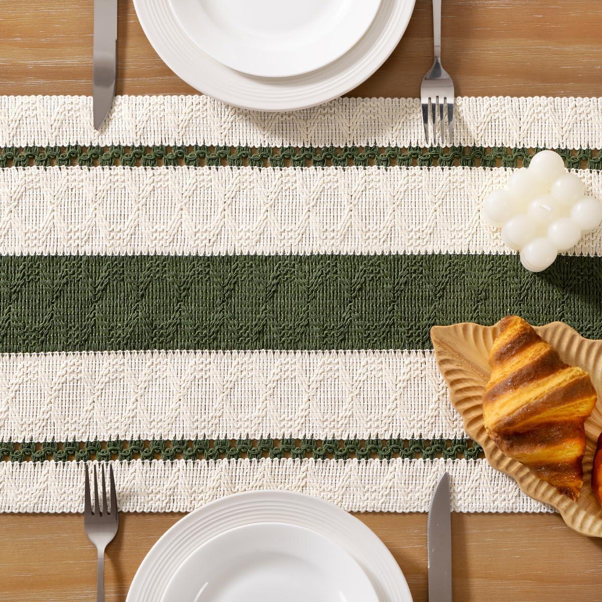 Socomi Boho Table Runner Macrame Fall Thanksgiving Farmhouse Woven Cotton Linen Rustic Coffee Table Runner with Tassels for Small Dresser Scarf Home Decor Dining Room 12×72 inch Champagne(Olive Green & Ivory)