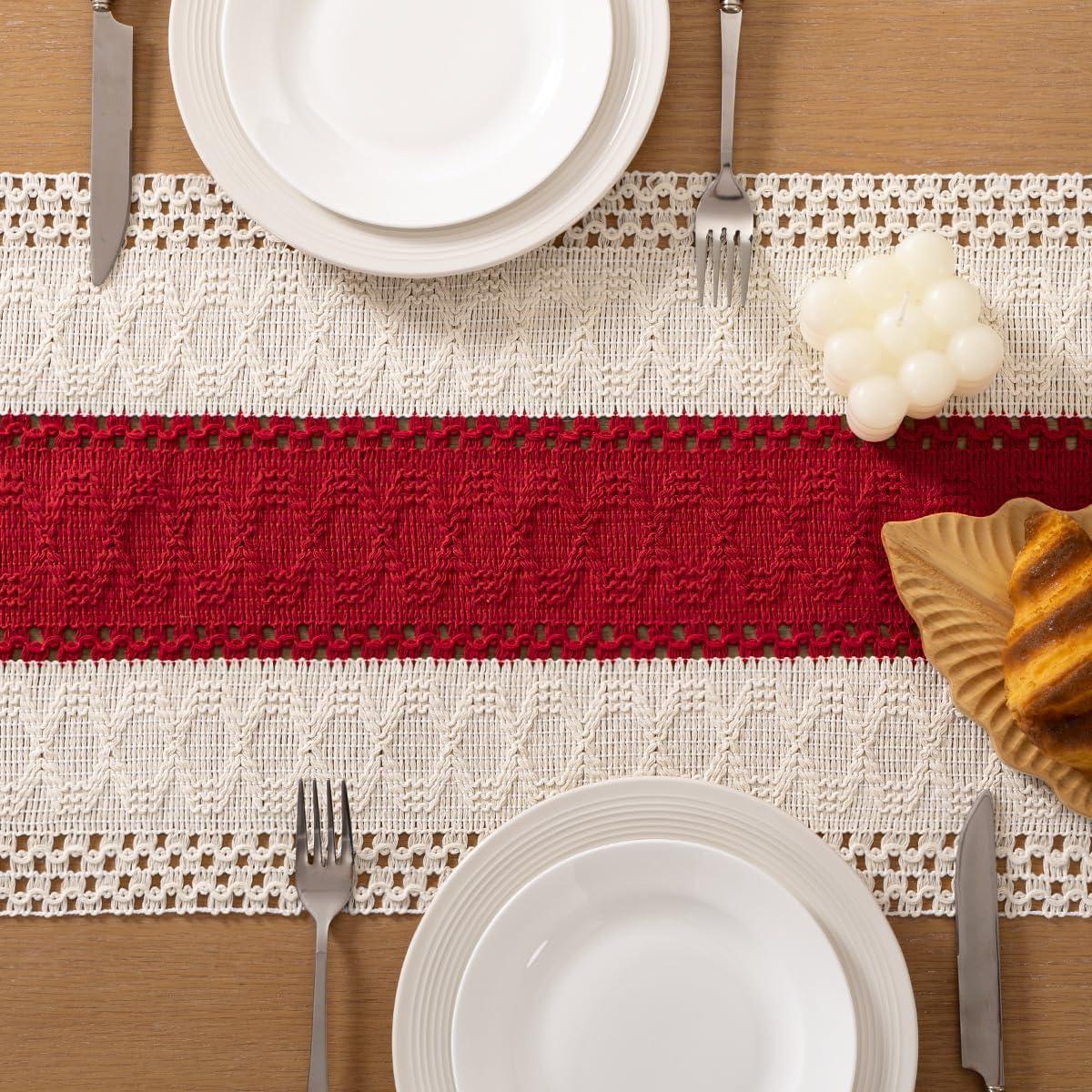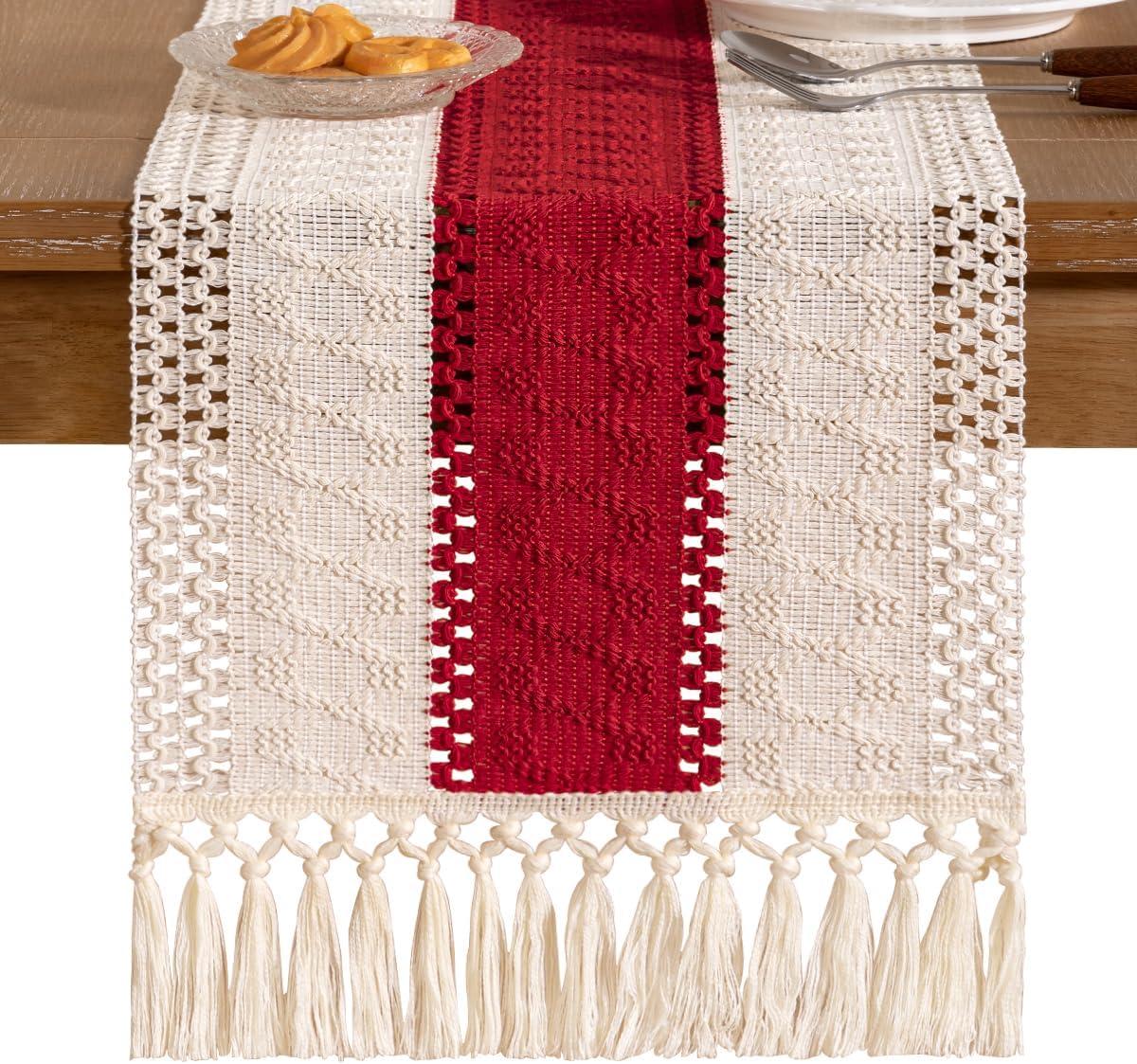 Socomi Boho Table Runner Macrame Fall Thanksgiving Farmhouse Woven Cotton Linen Rustic Coffee Table Runner with Tassels for Small Dresser Scarf Home Decor Dining Room 12x72 inch Champagne(Red & Ivory)