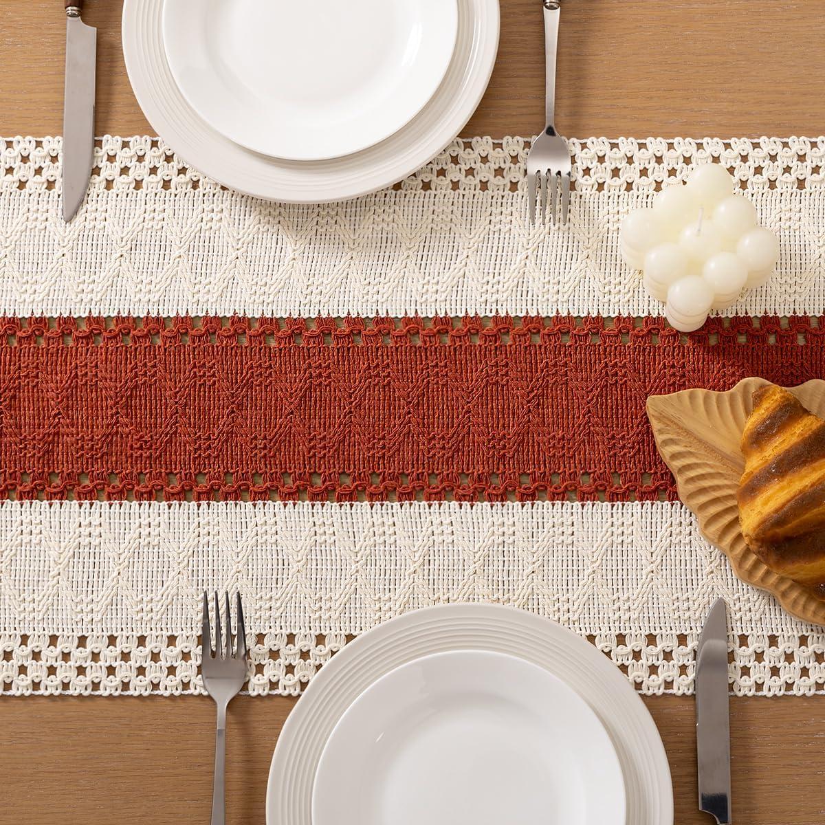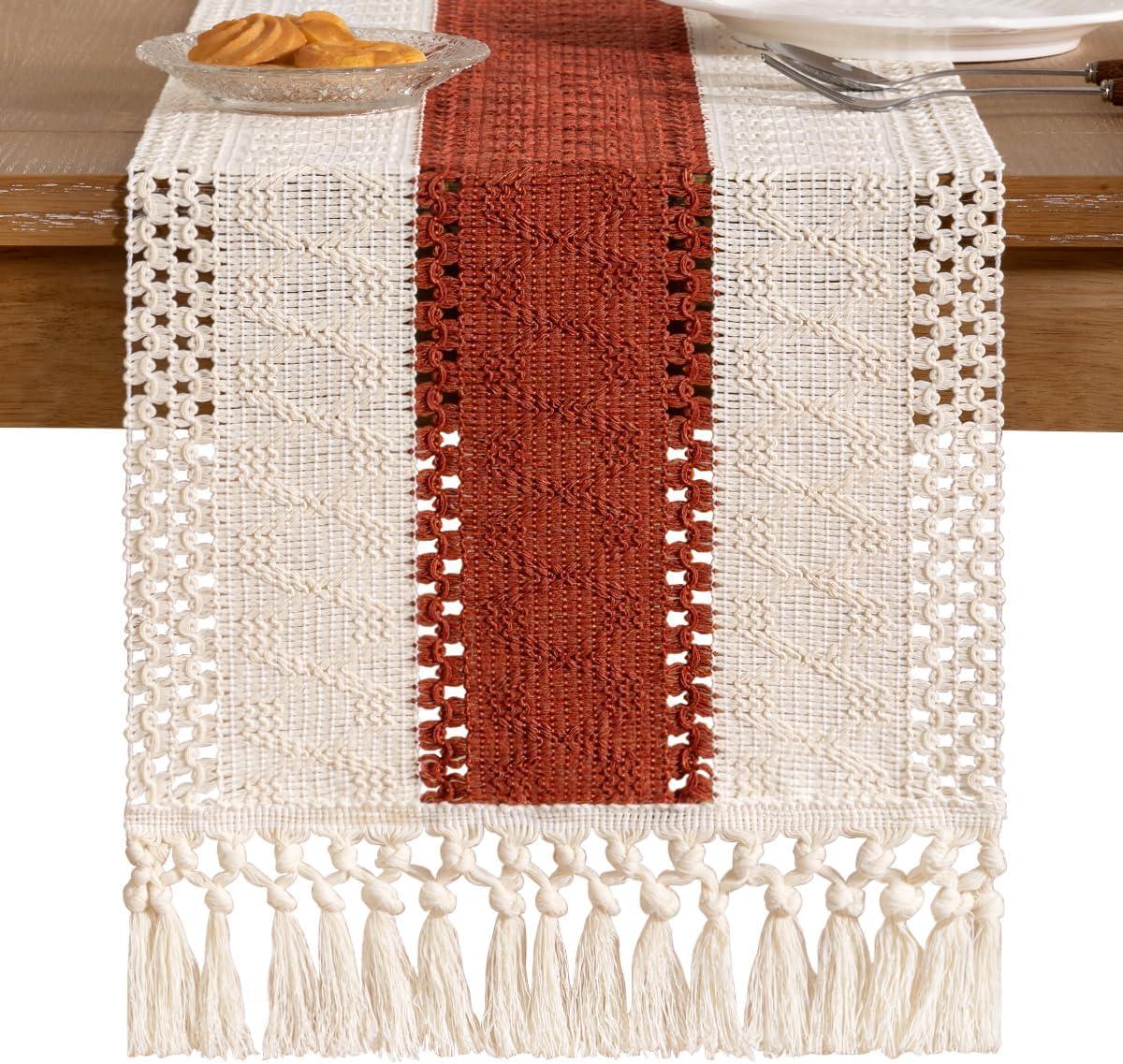 Socomi Boho Table Runner Macrame Fall Thanksgiving Farmhouse Woven Cotton Linen Rustic Coffee Table Runner with Tassels for Small Dresser Scarf Home Decor Dining Room 12x72 inch Champagne(Terracotta & Ivory)