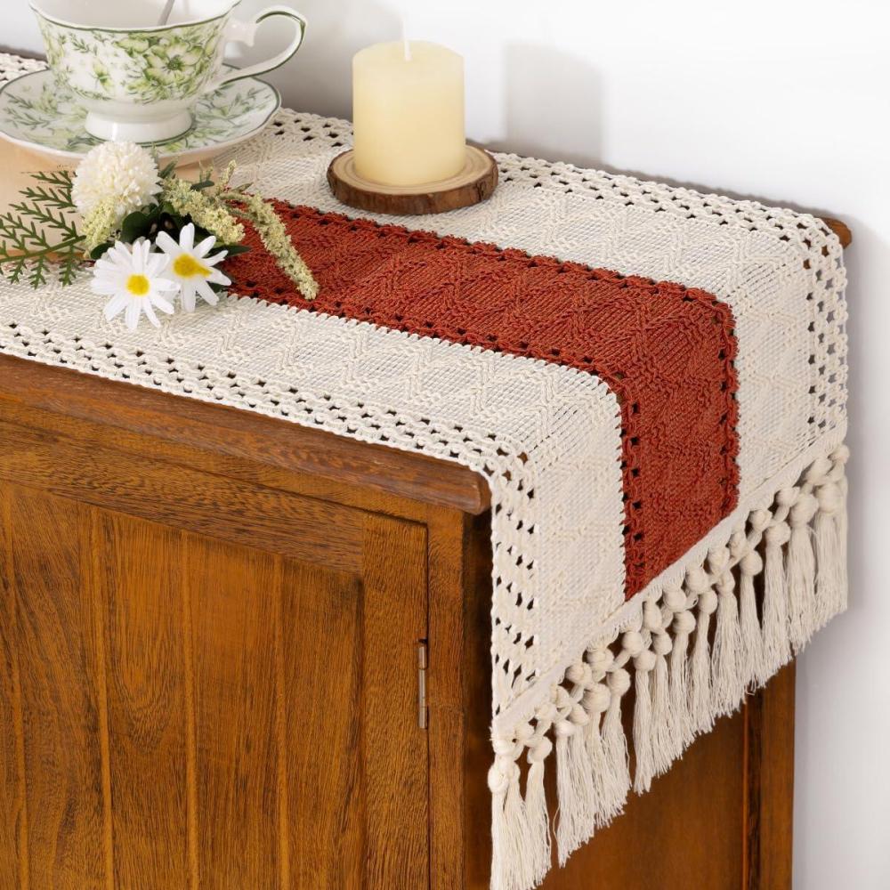 Socomi Boho Table Runner Macrame Fall Thanksgiving Farmhouse Woven Cotton Linen Rustic Coffee Table Runner with Tassels for Small Dresser Scarf Home Decor Dining Room 12×72 inch Champagne(Terracotta & Ivory)