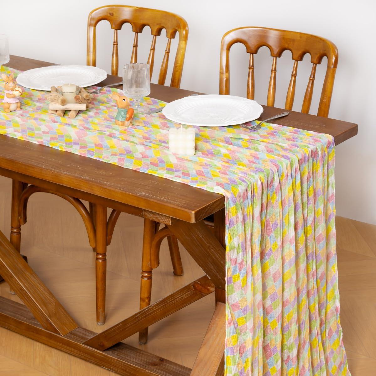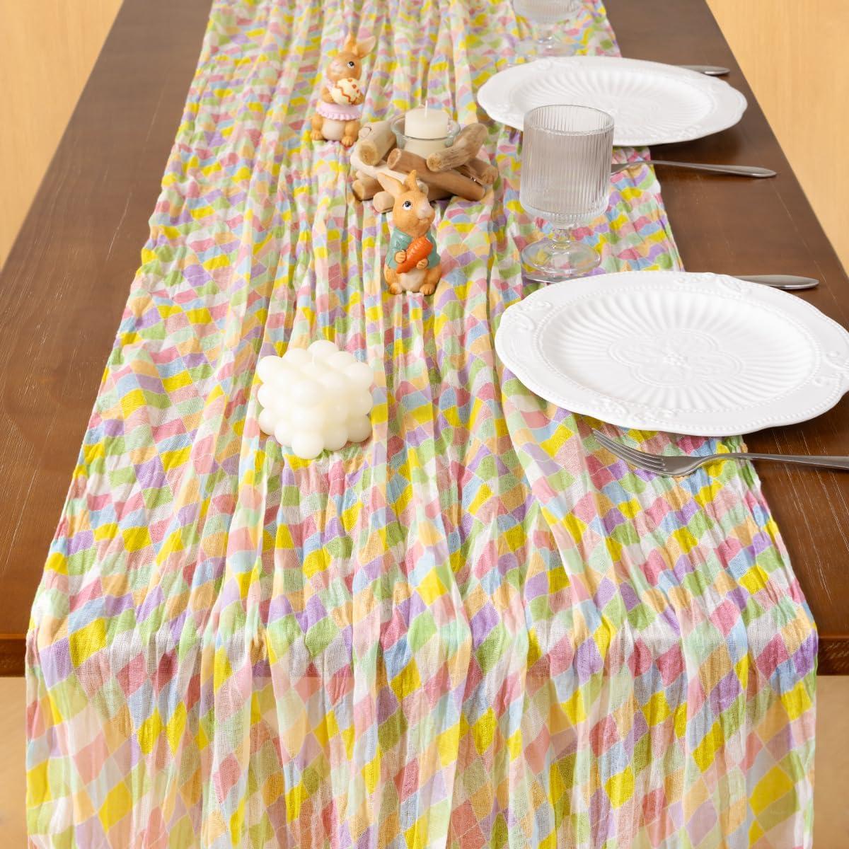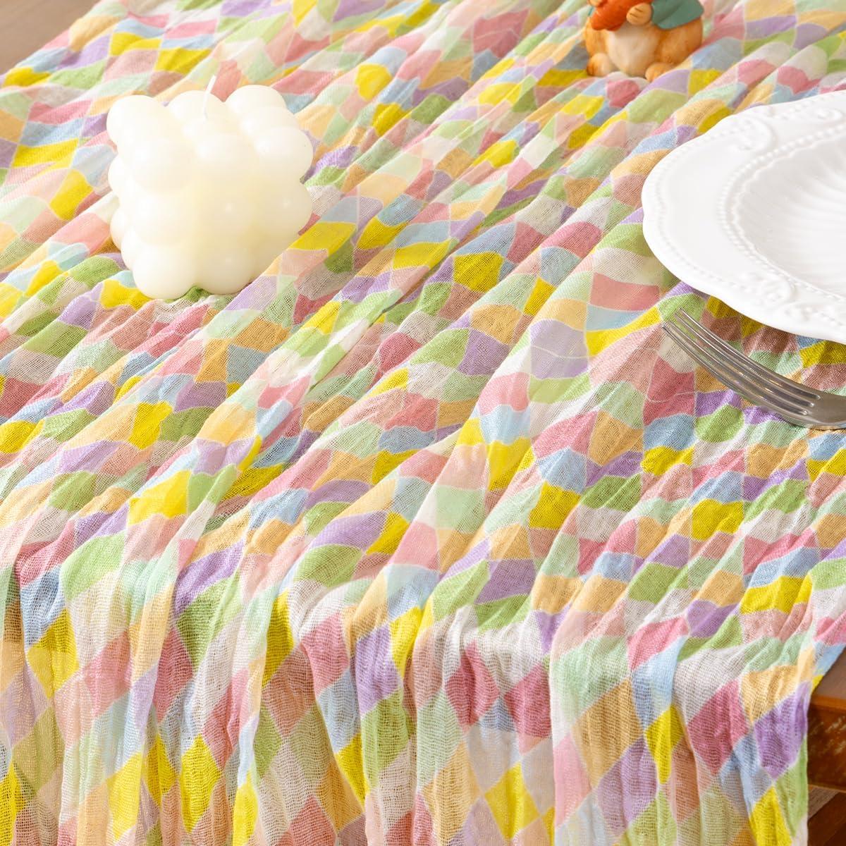 Socomi Easter Spring Table Runner Pastel Stripe Floral Cheesecloth Gauze 120 Inch Rustic Boho Cheese Cloth Runner for Wedding Party Baby Bridal Shower Decoration Holiday Home Decorations(Diamond)