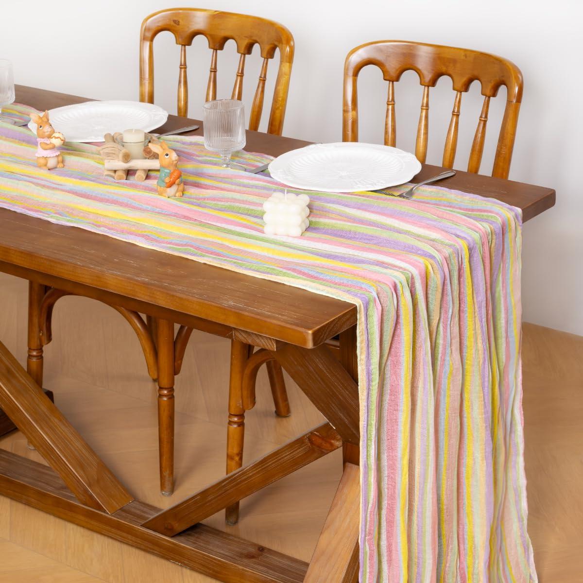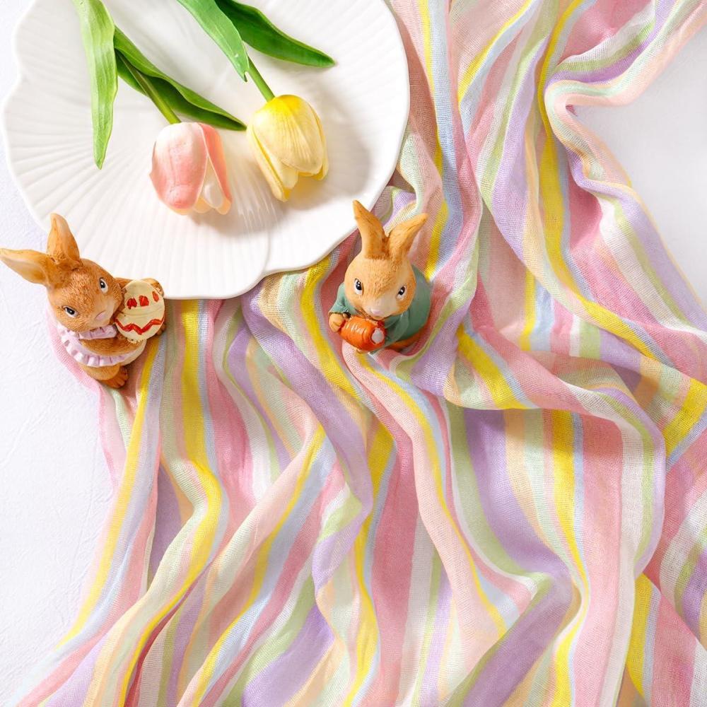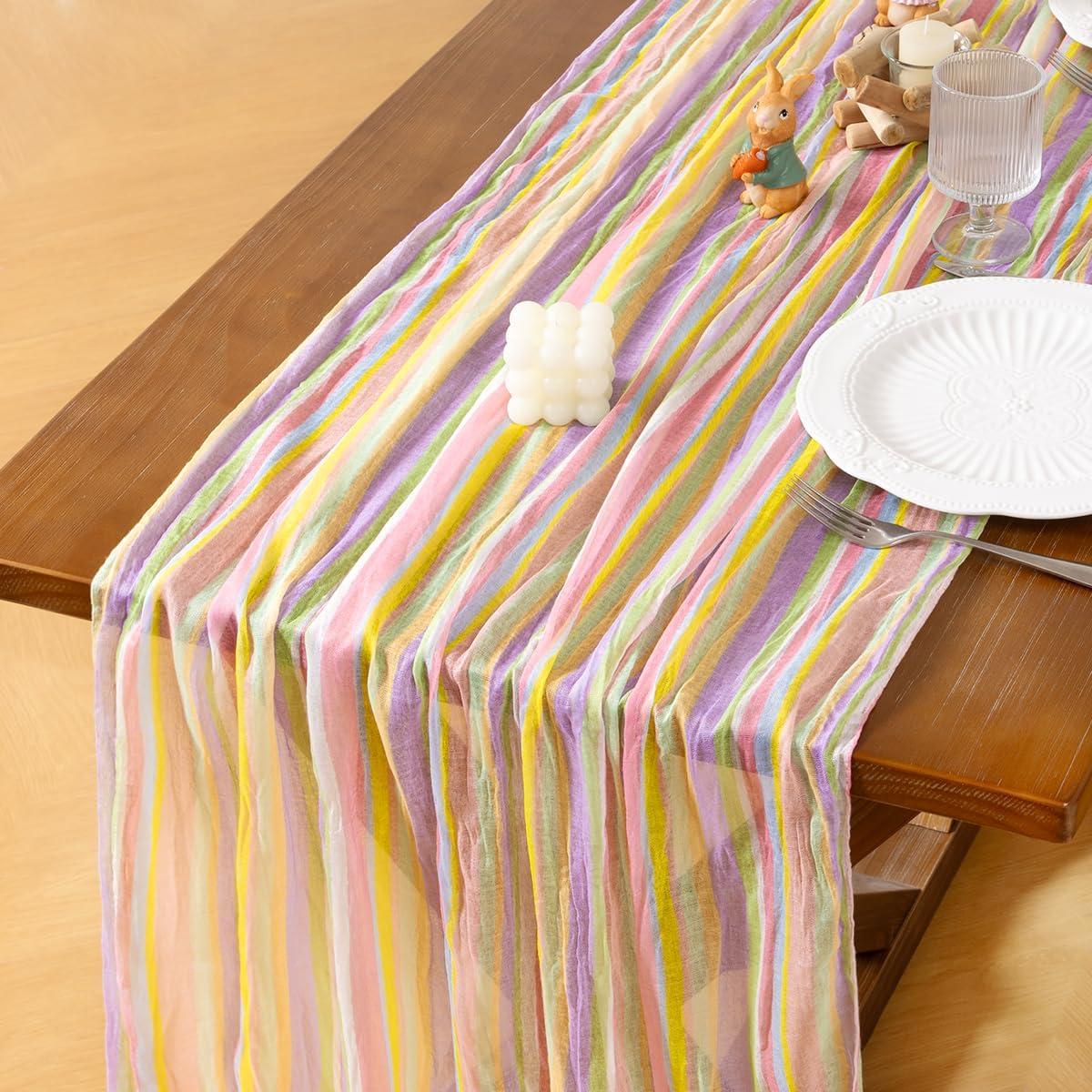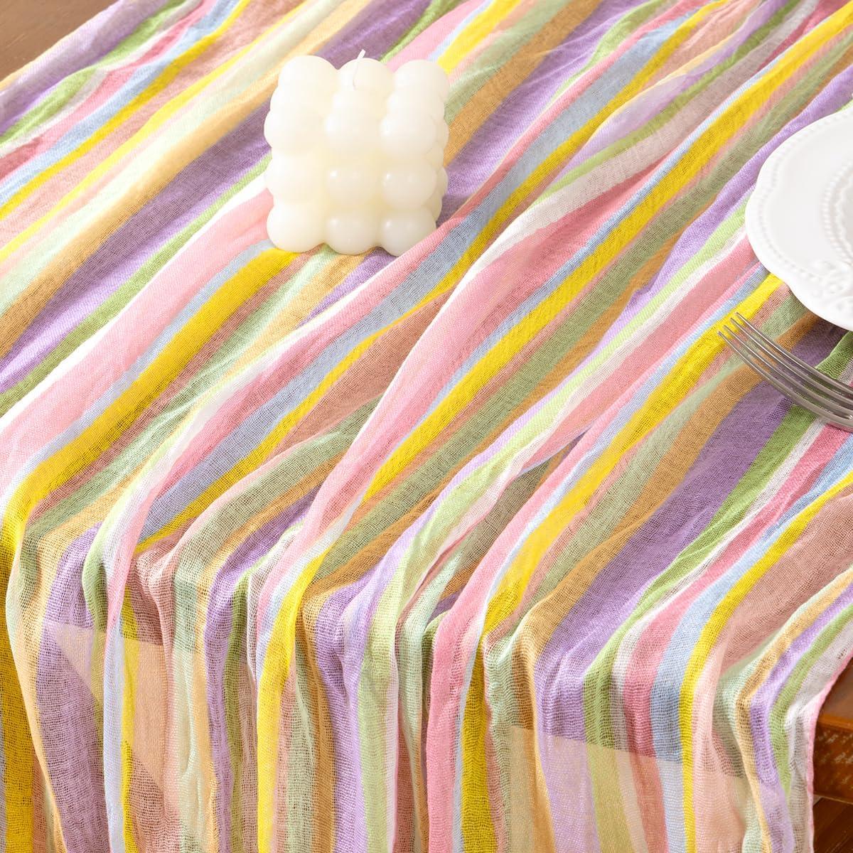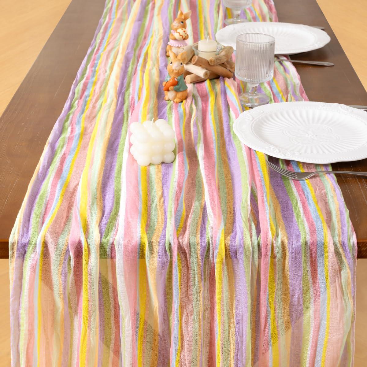 Socomi Easter Spring Table Runner Pastel Stripe Floral Cheesecloth Gauze 120 Inch Rustic Boho Cheese Cloth Runner for Wedding Party Baby Bridal Shower Decoration Holiday Home Decorations(Stripe)