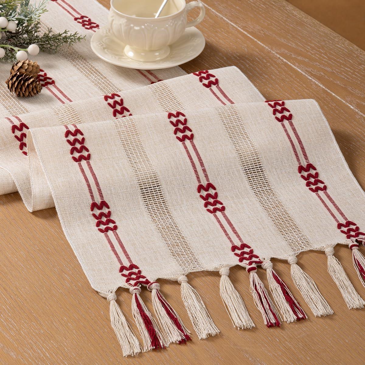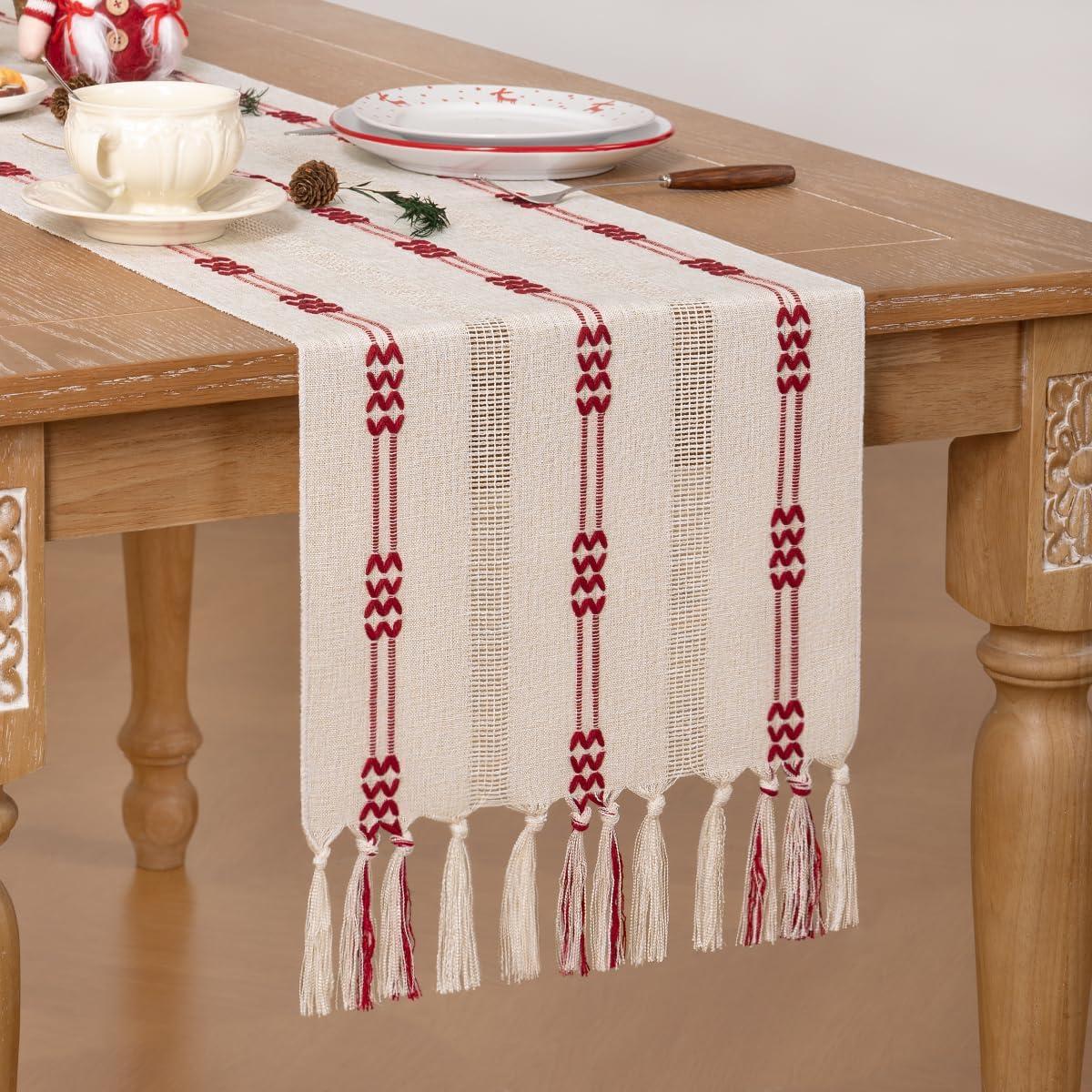 Socomi Farmhouse Table Runner 48 inches Macrame Woven Coffee Table Runner Cotton Rustic Fall ThanksgivingTable Runner with Tassels for Boho Home Decor Dining Living Room 13×48 inches Nude(Christmas Red)