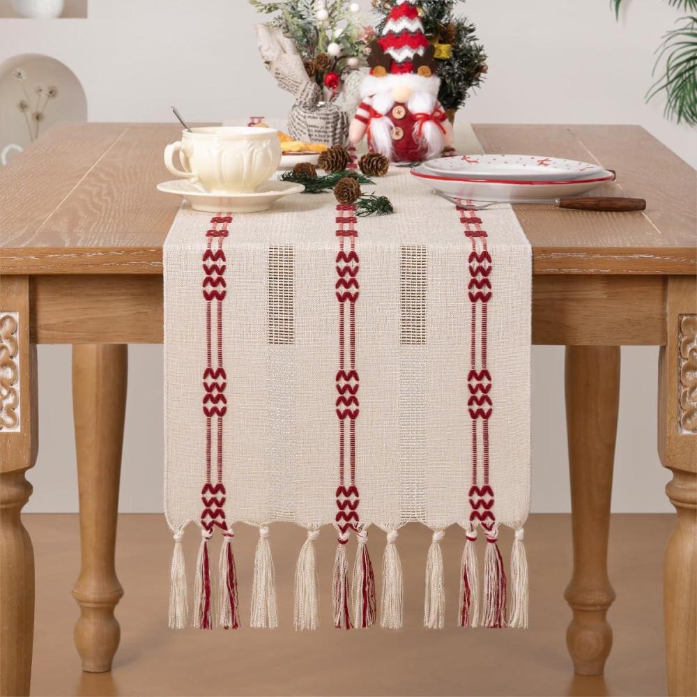 imageSocomi Farmhouse Table Runner 48 inches Macrame Woven Coffee Table Runner Cotton Rustic Fall ThanksgivingTable Runner with Tassels for Boho Home Decor Dining Living Room 13x48 inches NudeChristmas Red