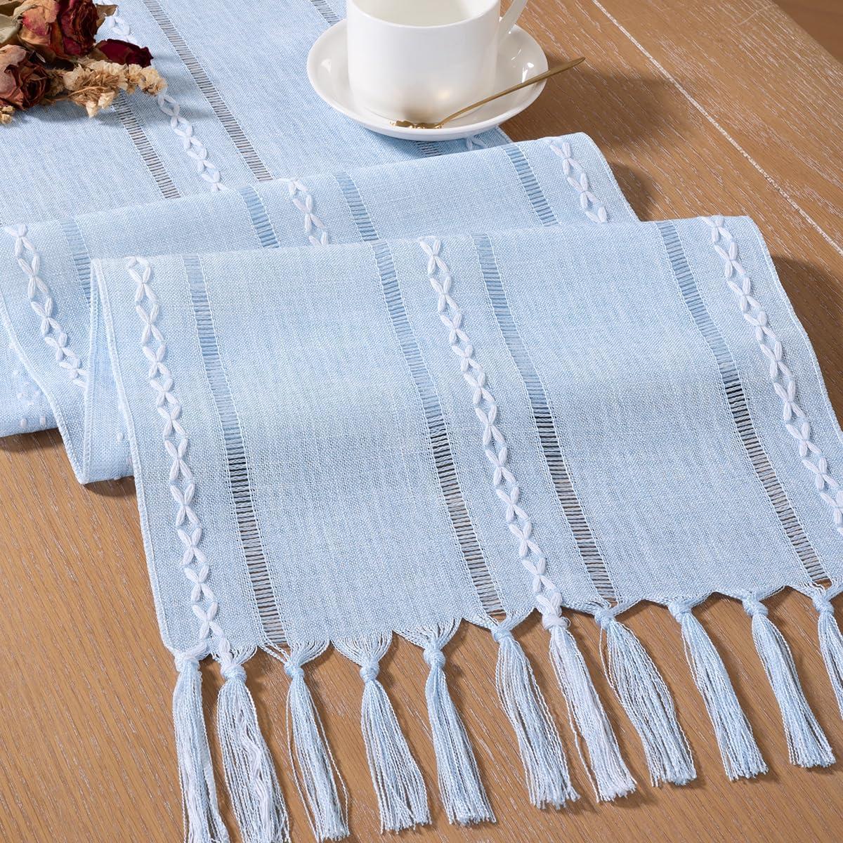 Socomi Farmhouse Table Runner 48 inches Macrame Woven Coffee Table Runner Cotton Rustic Fall Thanksgiving Table Runner with Tassels for Boho Home Decor Living Dining Room 13×48 inches Blue(Silver)
